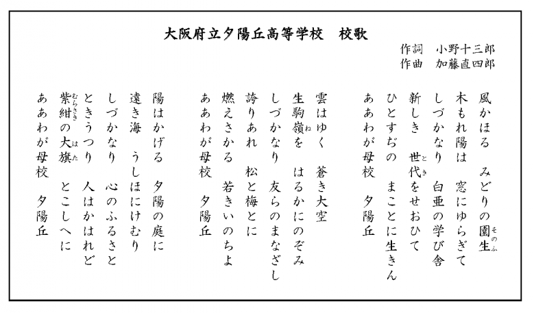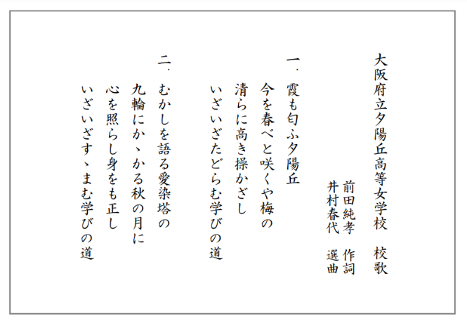 明治39年(1906年)に誕生した「島之内高等女学校」が、新築・移転に伴い校名を「夕陽丘高等女学校」と改称したのが明治42年。その年の2月18日、校歌を「我等をかりにあとふれば」から「霞も匂ふ夕陽丘」に改定。ここに旧制校歌は制定された。